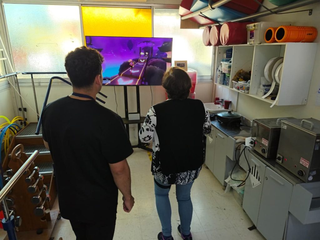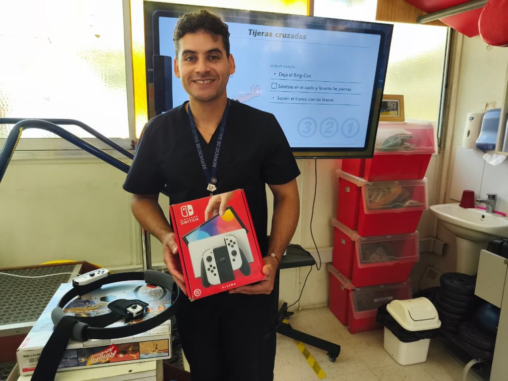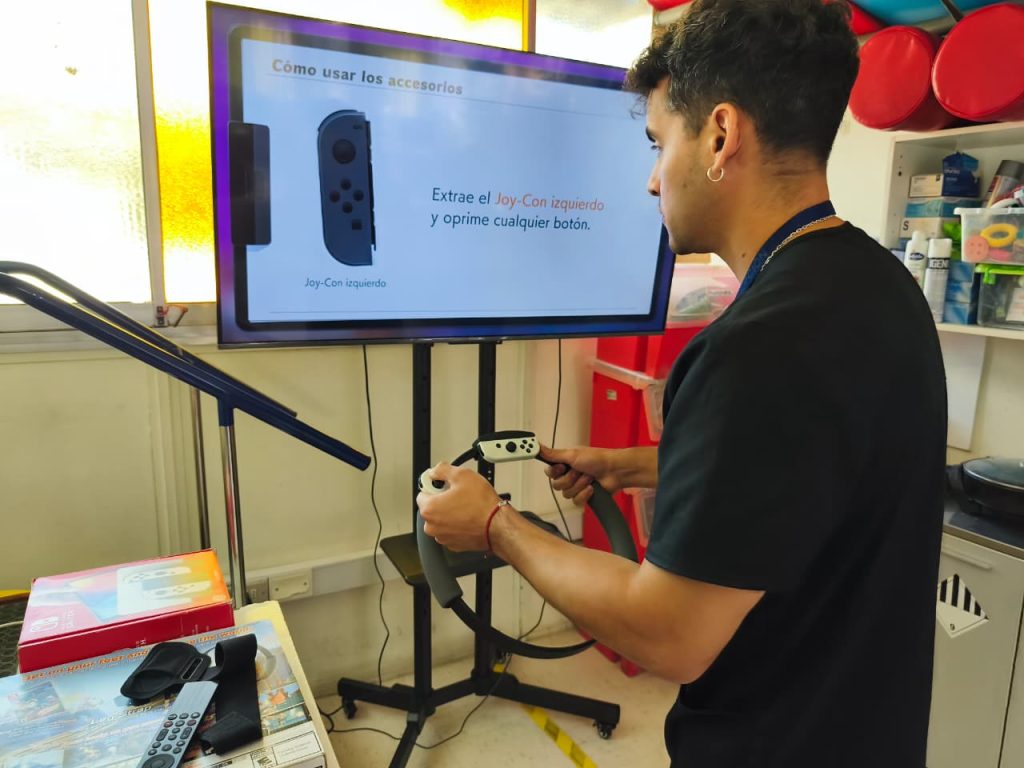 Pablo Tornería Morales, terapeuta ocupacional de la sala de rehabilitación, explicó que es “un elemento de realidad virtual que es no inmersiva, y que se trabaja a través del uso de un equipo tecnológico (Nintendo Switch) y que mediante un juego (Ring Fit), lo que hacemos es complementar los métodos tradicionales de rehabilitación, ya que han demostrado buenos resultados sobre aspectos motores y cognitivos principalmente”.